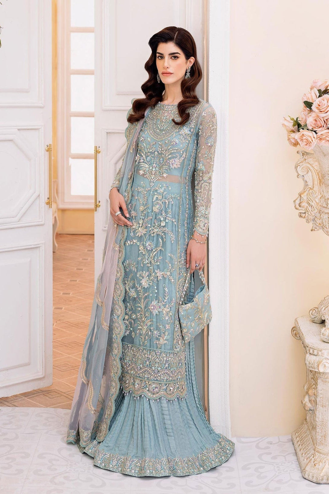 For those who love to wear pastel colours, along with a startle look, “Rimel” is the perfect design for you. This elegant dress features an organza base, delicately rendered floral motifs with jewel like neckline pattern on a hues of ferozi and pink. It is paired with double toned tranquil laser dupatta and crushed pants.