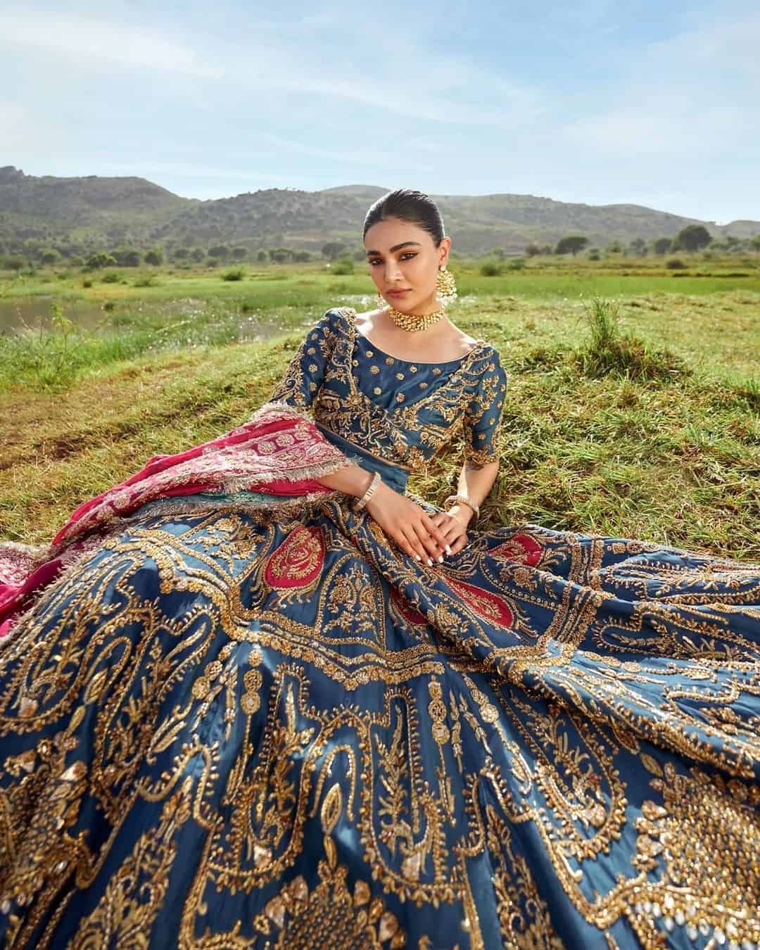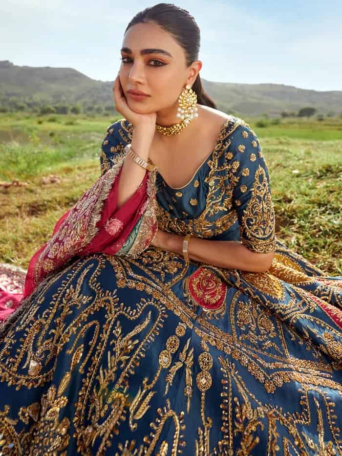 - Intricate golden handwork embroidery on the choli, lehenga, and sleeves.