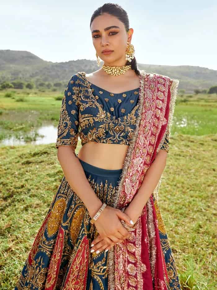 - Rich admiral blue raw silk lehenga with fuchsia and yellow accents.