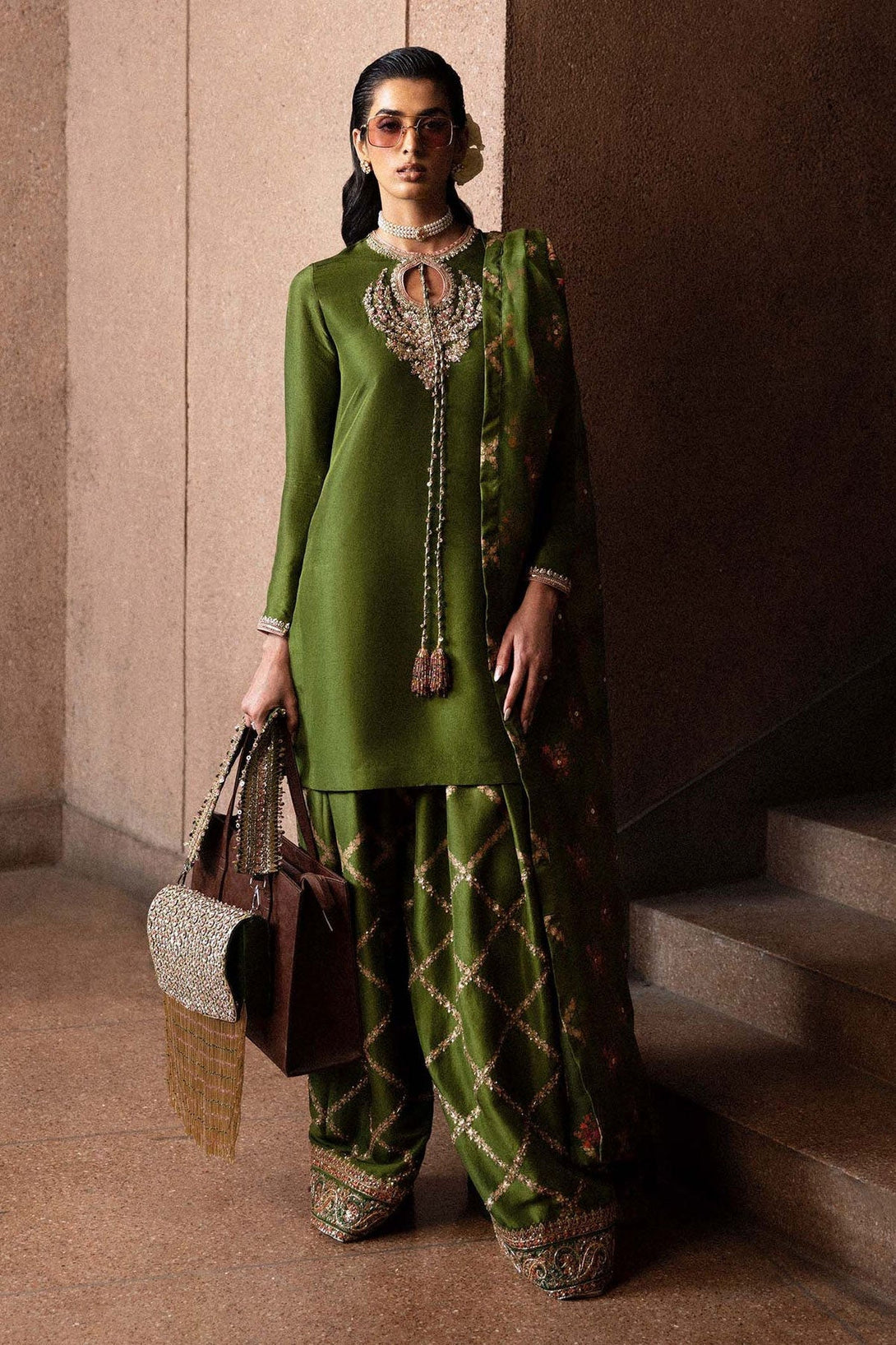 Additional Description: A regal olive green ensemble including a beautiful short raw silk shirt with embellishment detailing on neckline. The neckline is also adorned with gold sequins and naqshi with green, gold and pink buggle beads. It is paired with heavily embroidered and embellished shalwar. It comes with printed organza dupatta with block printed finishing on all four sides.