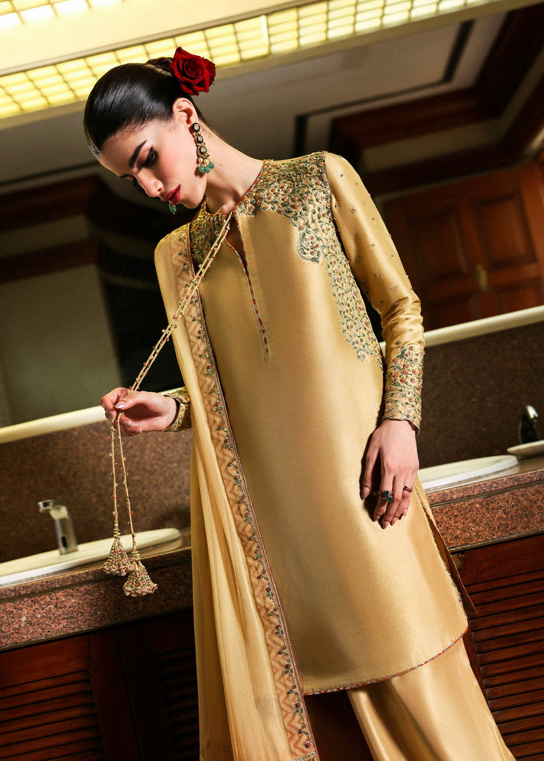 A gold raw silk shirt featuring delicate floral embroidery across the shoulders, sleeves, and side seams, elevated with handwork in cutdana and sequins. Rust chanderi silk trims and signature embellished tassels add dimension and contrast. Paired with flared gold pants, intricately finished with embroidery, embellishments, and rust chanderi silk lappa accents. A sheer chiffon dupatta completes the look, framed with rust trims and gold satin patchwork at each corner.