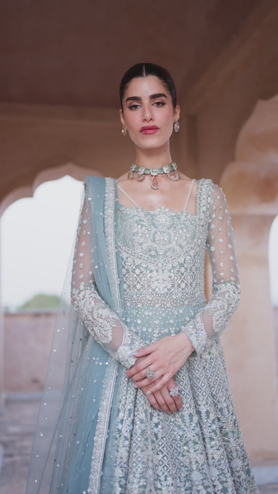 Description: Capturing the true essence of heritage crafts, Dorien mesmerizes. Cut from mint blue net, the pishwas dazzles with sequins, stones and resham adornments. Paired with an embellished tissue lehnga and embellished net dupatta, this piece will ensure you shine at your special events.