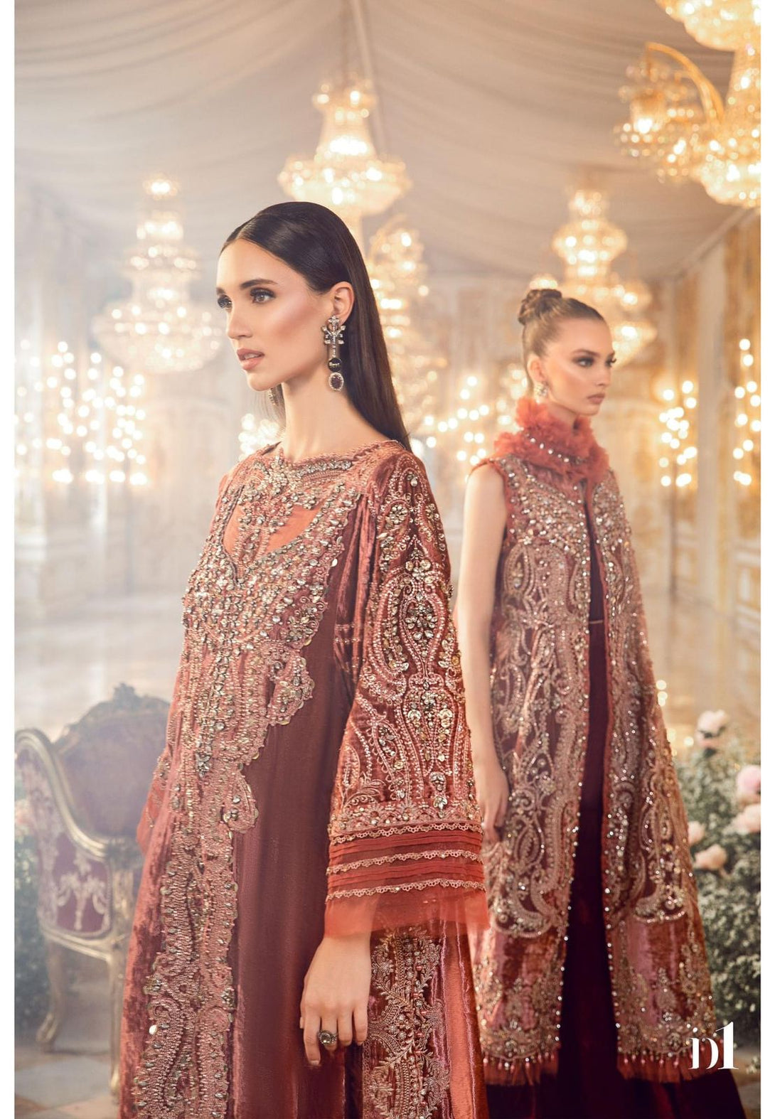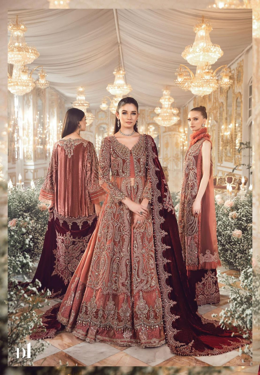 Step into the wedding affair with our salmon pink organza-jamawar four-piece embroidered ensemble hand embellished with intricate applique work and paired with velvet shawl.