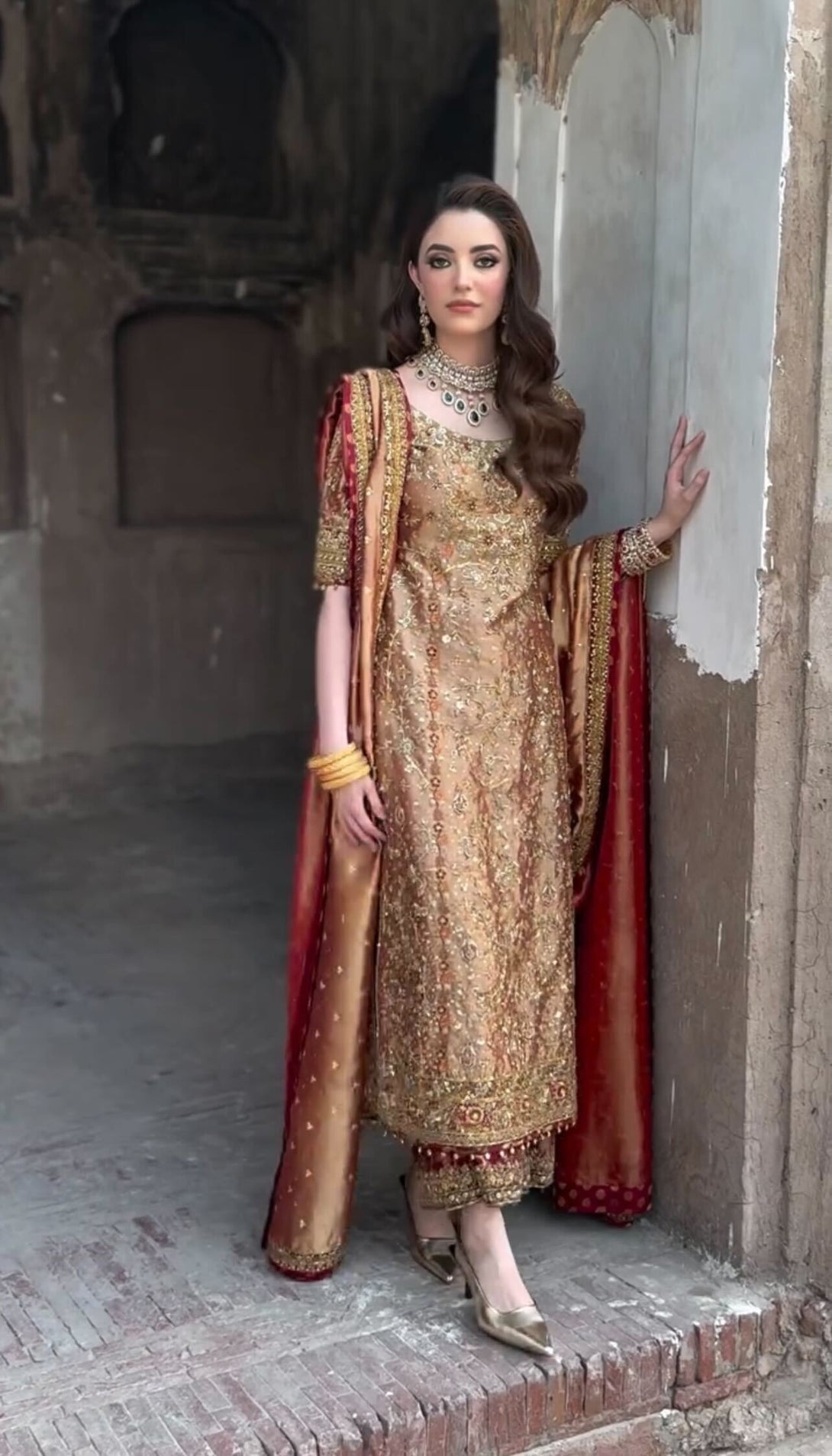 Make a grand statement in this luxurious deep bronze silk ensemble, exuding traditional opulence and timeless elegance. The outfit features delicate gold motifs throughout, complemented by intricate hand-embellished detailing on the hem and neckline. Paired with a rich matching dupatta bordered with embellished accents and subtle maroon piping.