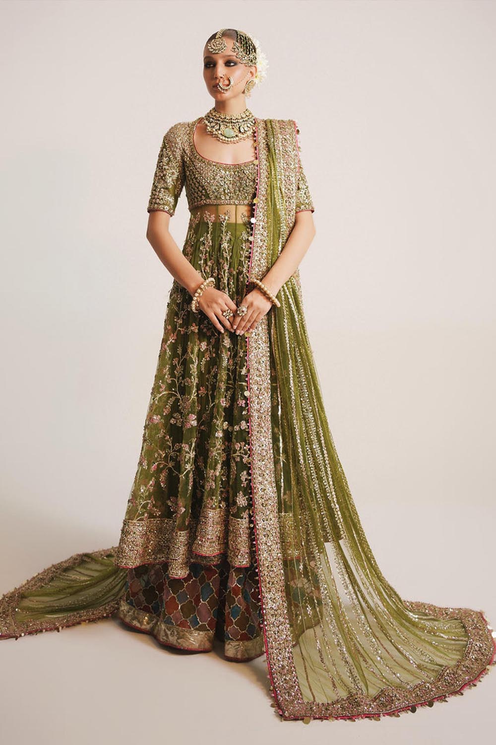 An outstanding stunner earthy green net peshwaz enhanced with intricate blush pink sequins and gold naqshi and dabka to create a graceful look. It is paired with minimal medium silk sharara with exquisitely embellished organza border. Its heavily embellished dupatta with alluring border is further enhanced with a slight pop of hot pink facings and an added lace detailing.