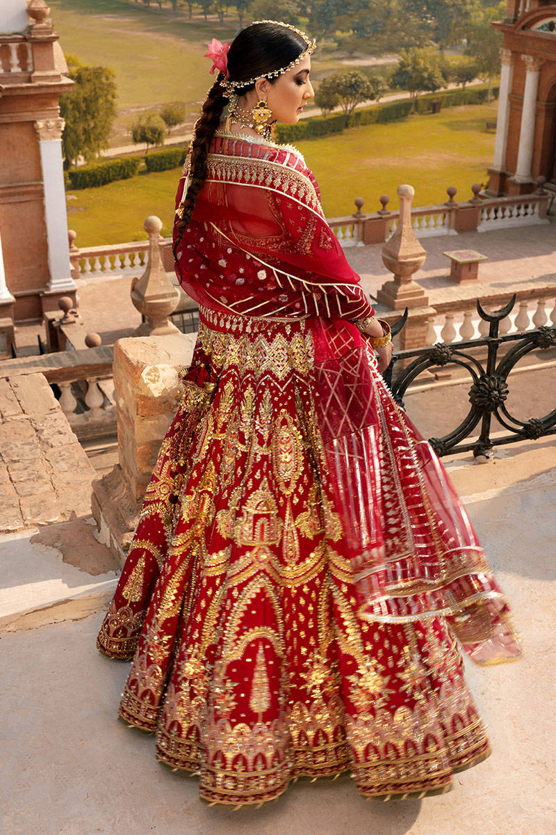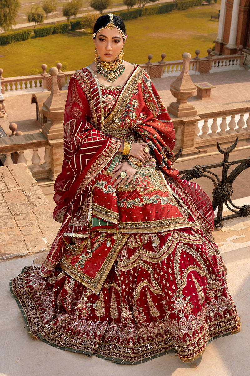 Nigarbano is our signature sindoori bridal set that comprises of a Russian silk lehnga choli extensively embroidered and composed using hand crafted embellishments of dabka,kora,sitari,pearl and marori. It comes with an embroidered and embellished dupatta finished with our signature chatta patti pallus and worn with a digitally printed silk shawl with hand embellished hammer work, dabka, pearl and gotta