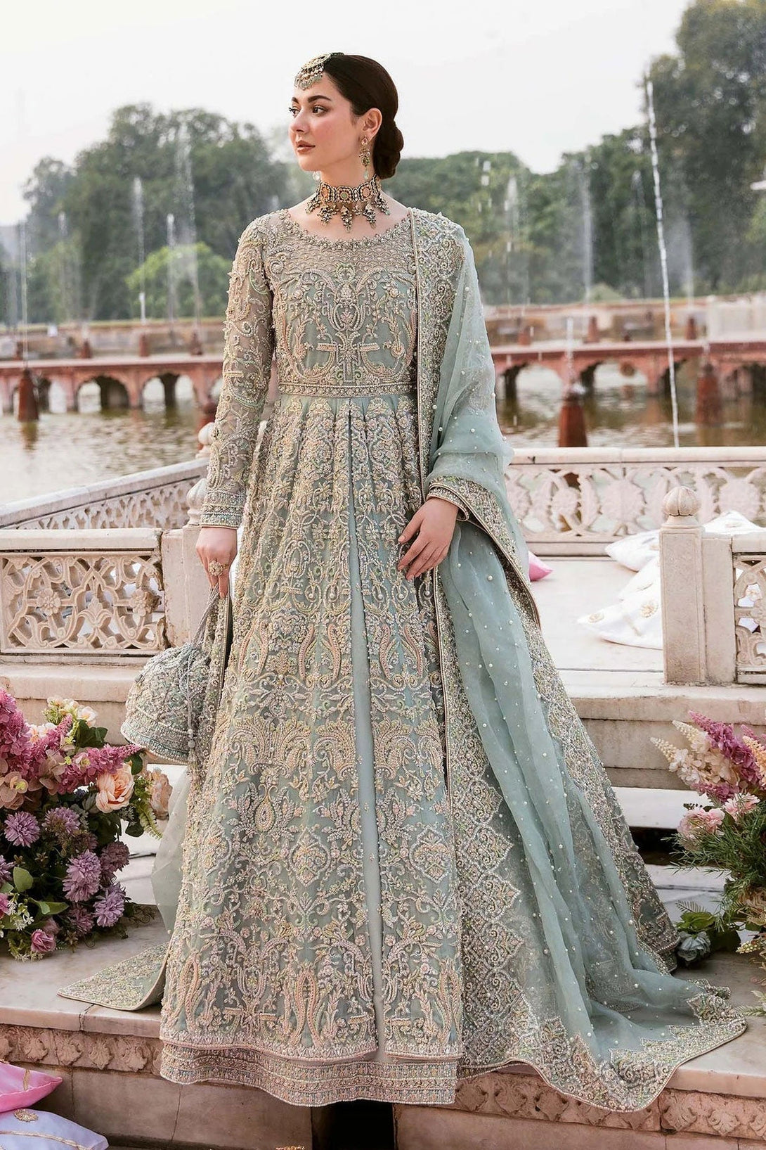 A chic and feminine couture look, “Saleha” consists of ice blue hued organza gown, bejeweled with naqshi, dabka, crystals, pearls, and sequins. Paired with self jamavar lehanga, with embellishment on the border. The outfit is paired with heavily embellished organza dupatta with all around border and center spray of motifs and pearls.