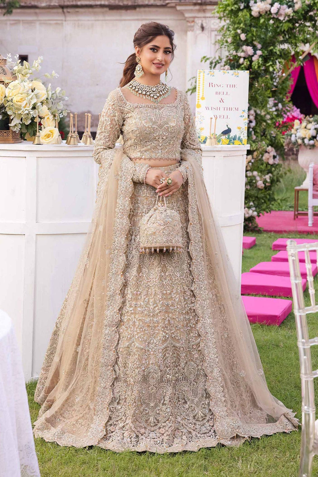 his mystic net article with embroidered panels and hand embellished to create a spectacular heritage Lehenga Choli with a fully composed bodice. This skillfully made piece is portrayed in a nude hue and balanced with an embroidered net dupatta in addition to enhance its grace.