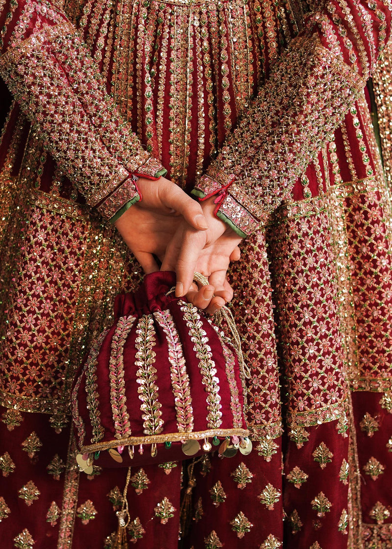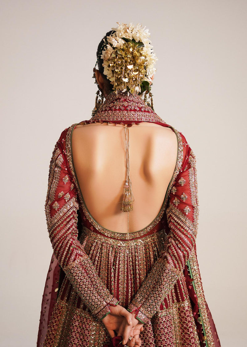 This ravishing bridal outfit is rendered in a beautiful shade of berry red composed on an organza front open peshwas with an intricate and exquisite detailed adda work of sequins, Buggle beads, resham, nakshi and dabka makes truely an artwork. Lehnga feautures all over handwork chatta and a detailed border enhanced with nakshi and stonework. To complete the look paired it with organza duppata composed of heavy chatta in the middle and heavy embellished four side border finished with an accent color of sage green gives an ethnic regality.