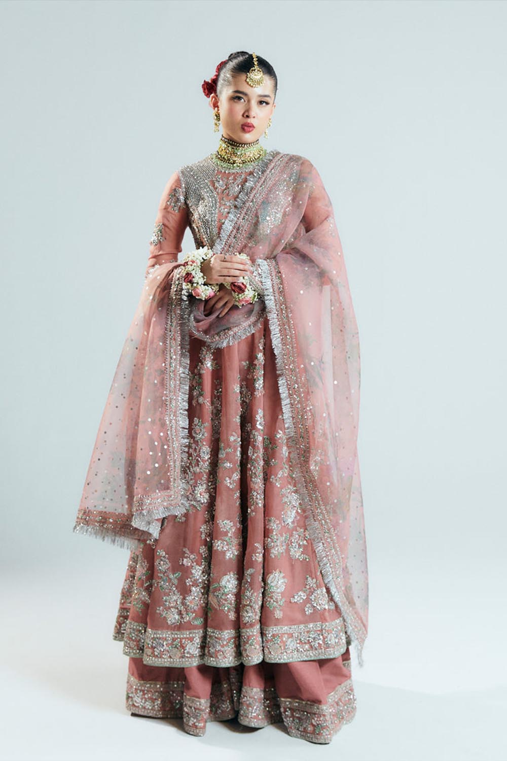 A Classic Coral organza Peshwas intricately embellished with silver dabka, naqshi and sequins. Further it is paired with korean rawsilk sharara with heavy embellished border completing the over all look with digital printed dupatta enhanced with foil print and heavy embellished border. Detailed embellishment on the entire outfit makes it a perfect fit for any formal occasion.