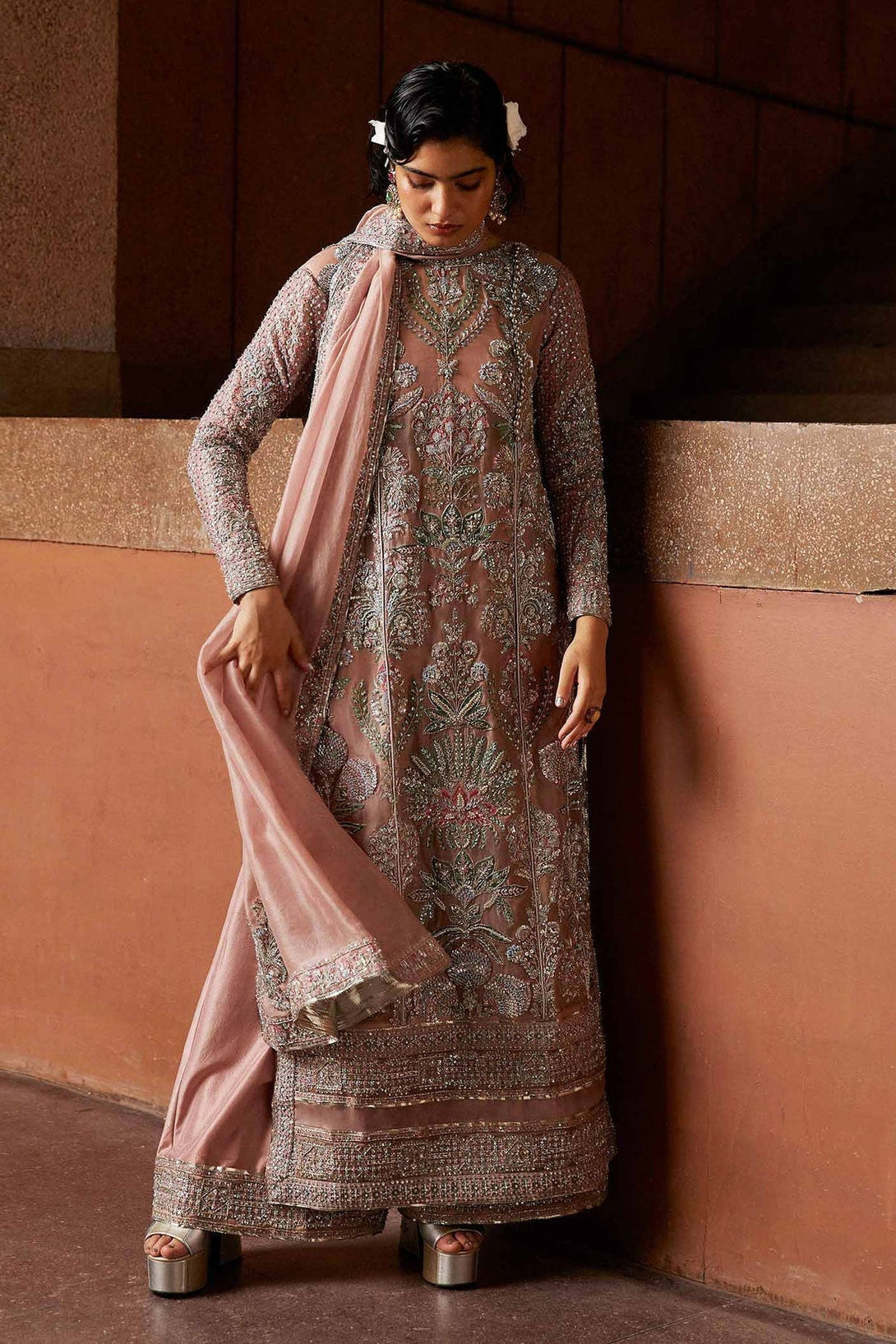 This regal outfit rendered in a beautiful shade of Pink on an organza canvas for shirt and Raw-silk palazzo, with heavy embellished motifs along with intricate details. The timeless look is completed with an organza dupatta along with four side heavy embellished borders with 3 different corner motifs embellished with sequins, cut dana and with nakashi, dabka concluding the look marvelously.