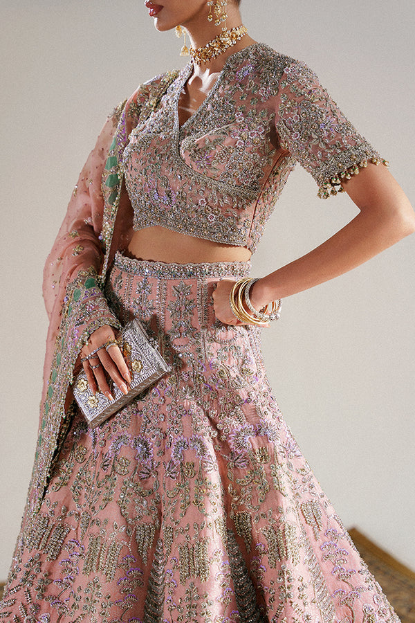 - CORAL ORGANZA CHOLI IN A WRAPPED SILHOUETTE, ADORNED WITH LILAC, PINK, GREEN EMBROIDERY AND SIGNATURE GOTTA DETAILING